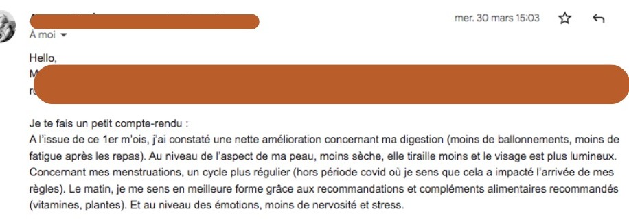 - Séance initiale + protocole de naturopathie (PDF) avec conseils en alimentation, plantes, compléments de qualité, orientation analyses possibles